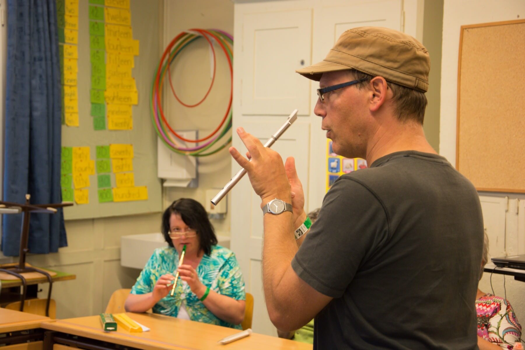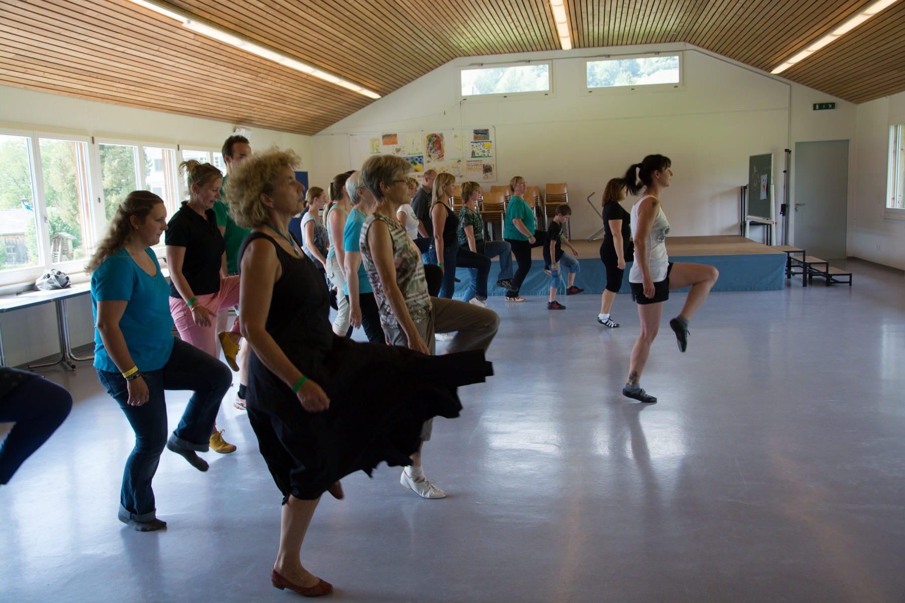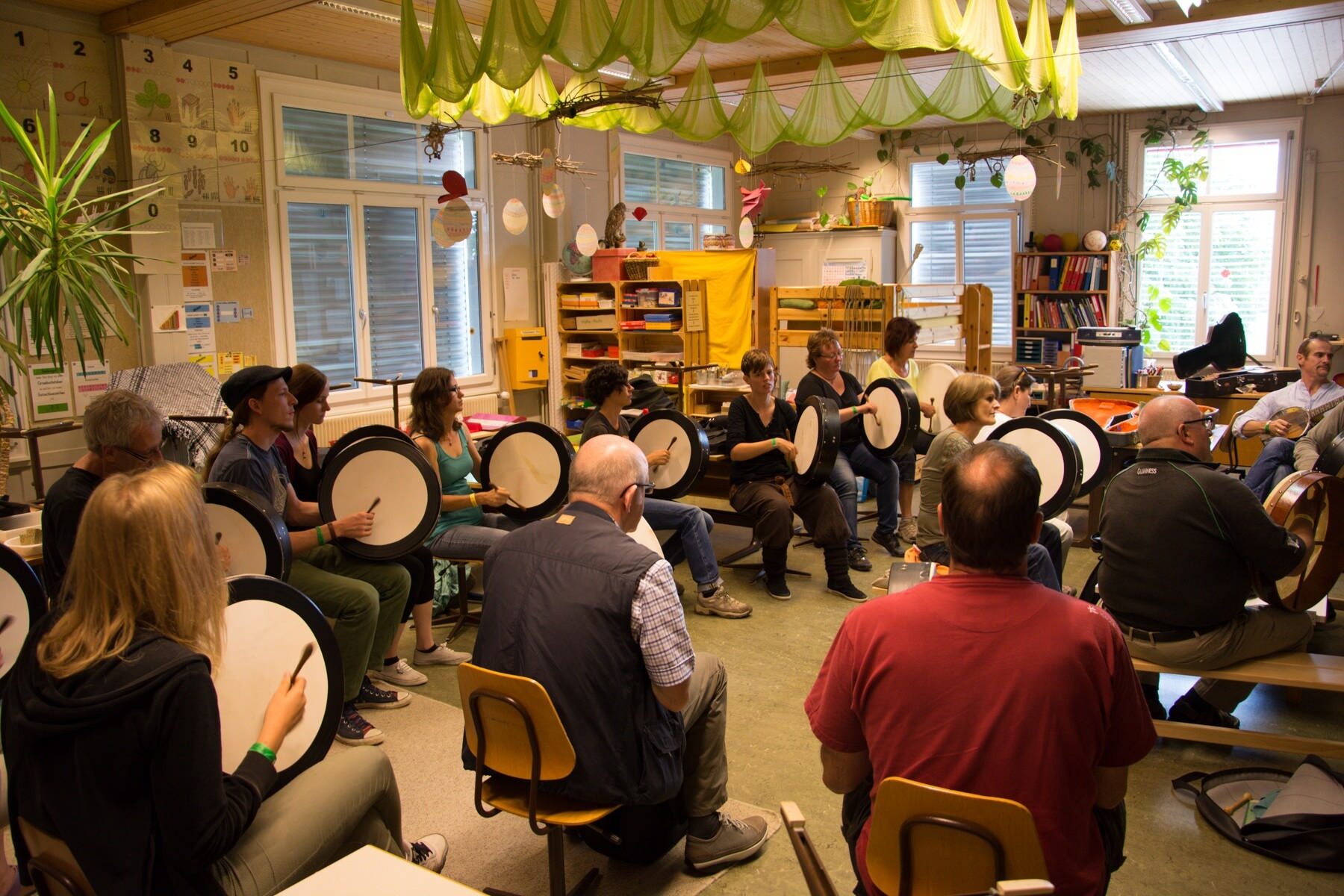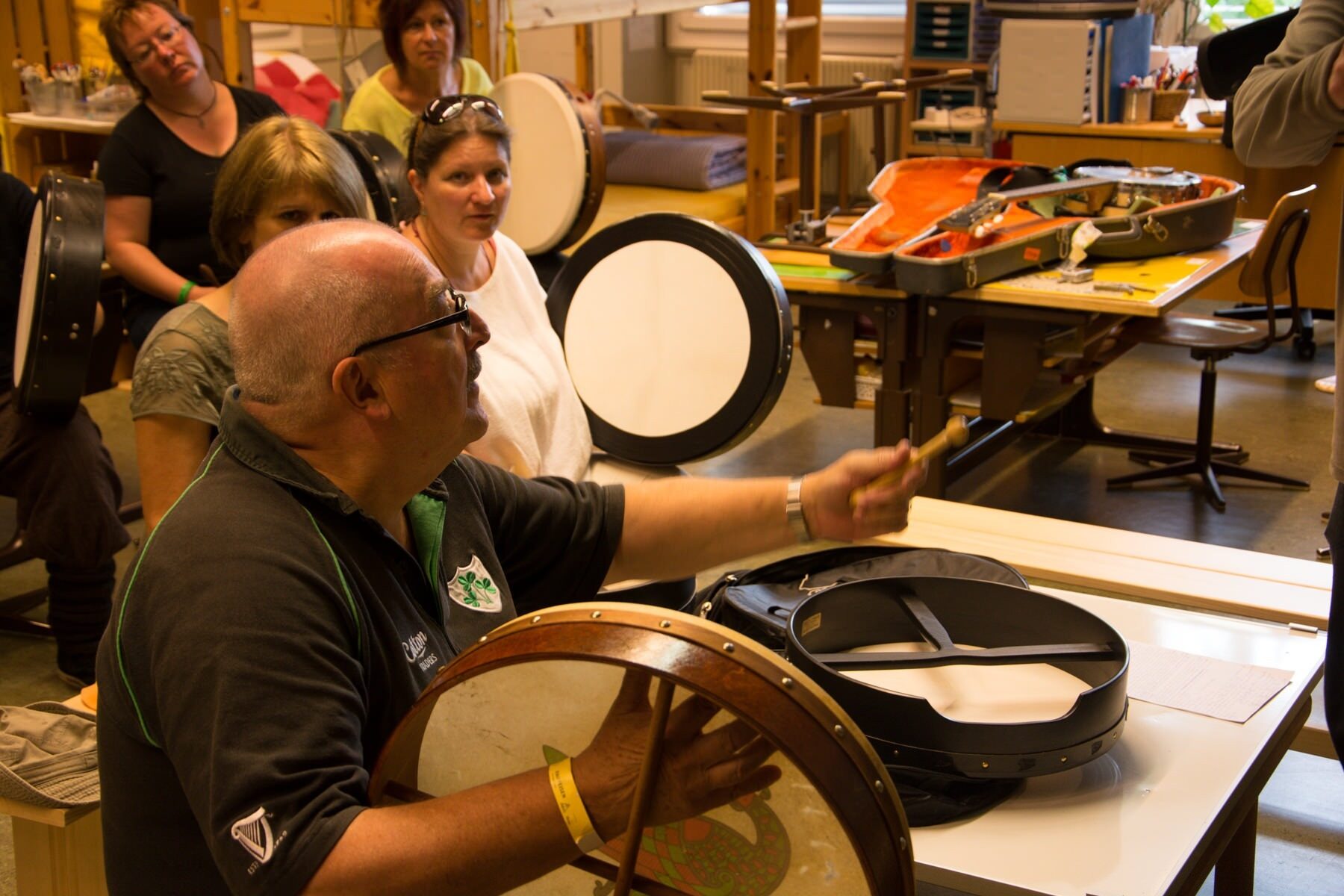 Die Workshops, die jeweils am Samstagnachmittag stattfinden, waren dieses Jahr ausgebucht. Die Teilnehmenden konnten sich einfache Tanzschritte aneignen, das Flötenspiel erlernen oder das Instrument Bodhrán kennenlernen. Das Erlernte des Bodhrán-Kurses wurde anschliessend auf der Hauptbühne vor versammeltem Publikum präsentiert.